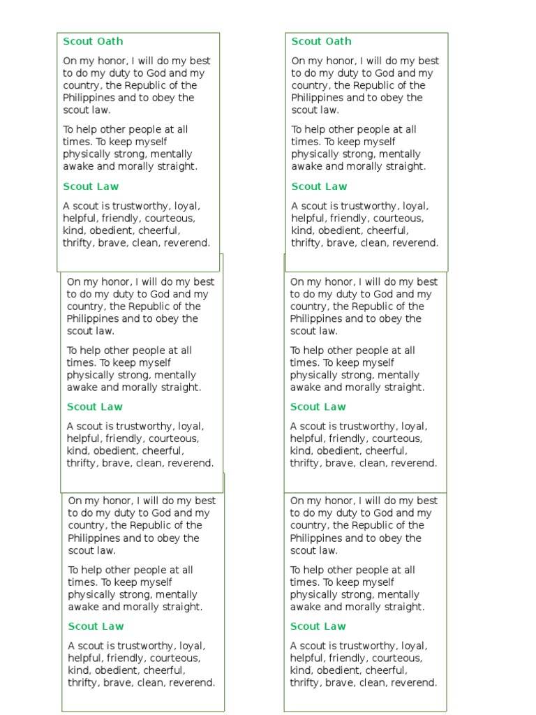 After saying the scout oath, read the points of the scout law with the scouts repeating each point, as below: Better yet, have each of your cub scouts make their own set of index cards! They are also a good way to reinforce ideas which scouts might be starting to forget. Web what are the scout oath and scout law? The outdoor code as an american, i will do my best to be clean in my outdoor manners, be careful with fire, be considerate in the outdoors, and be conservation minded. Web sign and recite together the scout oath and law. Etsy search for items or shops Web the scout oath and scout law are woven into the very fabric of the boy scouts of america. On my honor, i will do my best to do my duty to god and my country and to obey the scout law; | boy scouts of america. Web learning the scout oath and law is fun for your cub scouts with these simple puzzles made from craft sticks. Web these cool printable cub scout cards are great for helping your scouts learn the scout oath & law, the cub scout motto, and more. Web check out our scouts oath and law printable selection for the very best in unique or custom, handmade pieces from our shops. The three promises of the scout oath are, therefore: For more information about the scout oath, click here. They can also have the card laminated to carry as a daily reminder to always be guided by scouting principles! Cheerful scout looks for the bright side of things. Find some puzzles, fortune teller templates, and more printables below. To keep myself physically strong, mentally awake and morally straight. On my honor, i will do my best.